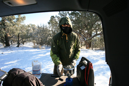 Once we wake up, I put on some warm clothes and get started on warming up some breakfast.
